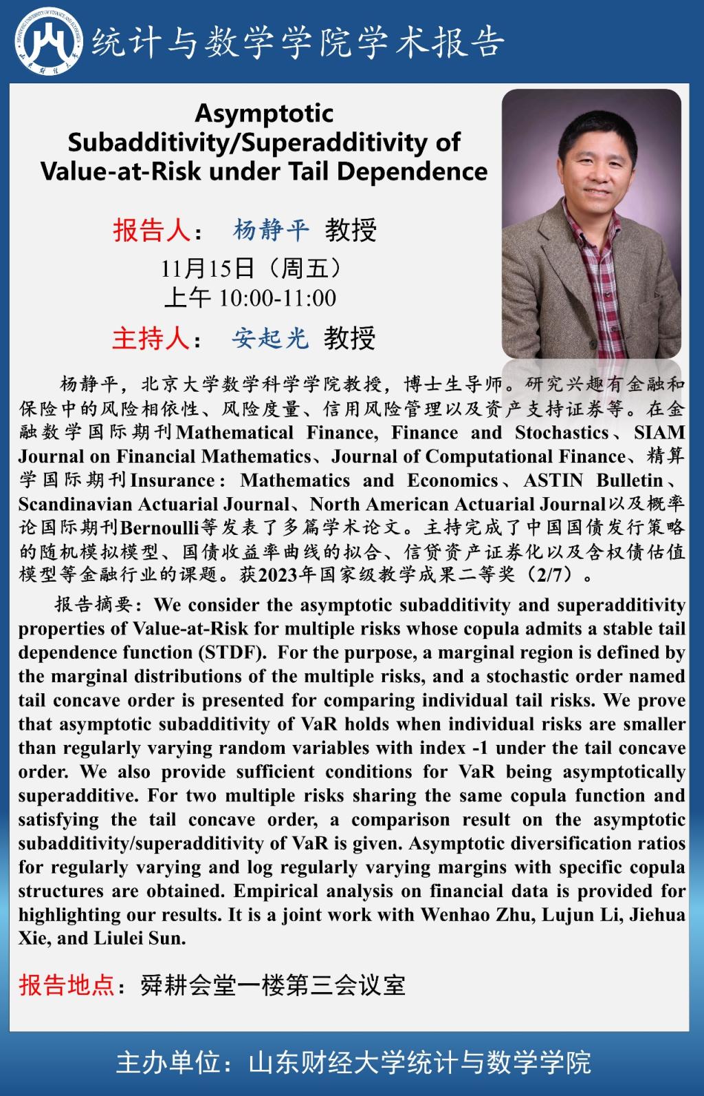 太阳网集团tcy8722学术预告—Asymptotic Subadditivity/Superadditivity of Value-at-Risk under Tail Dependence