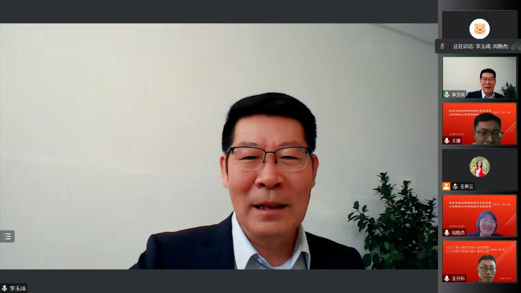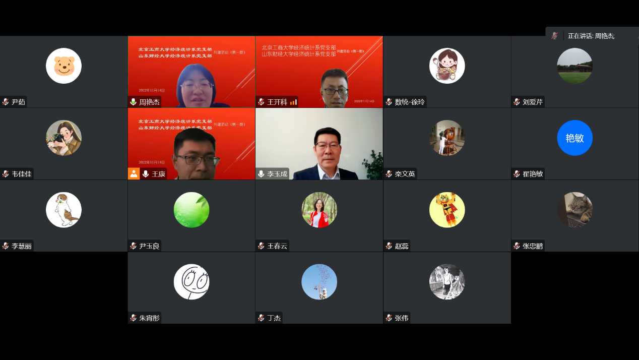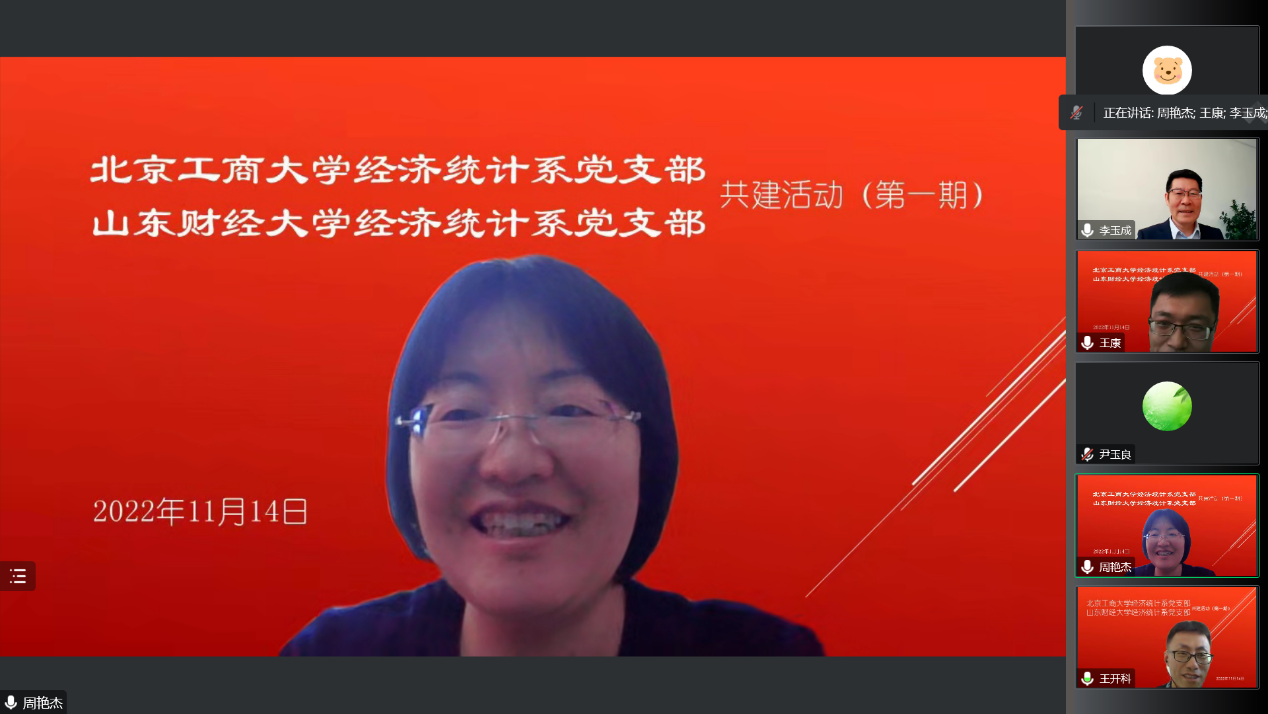 我院党委书记李玉成、北京工商大学数学与统计学院党委书记周艳杰,以及两校经济统计系支部的党员教师和部分研究生代表参加线上交流,活动由北京工商大学经济统计系主任王康主持。