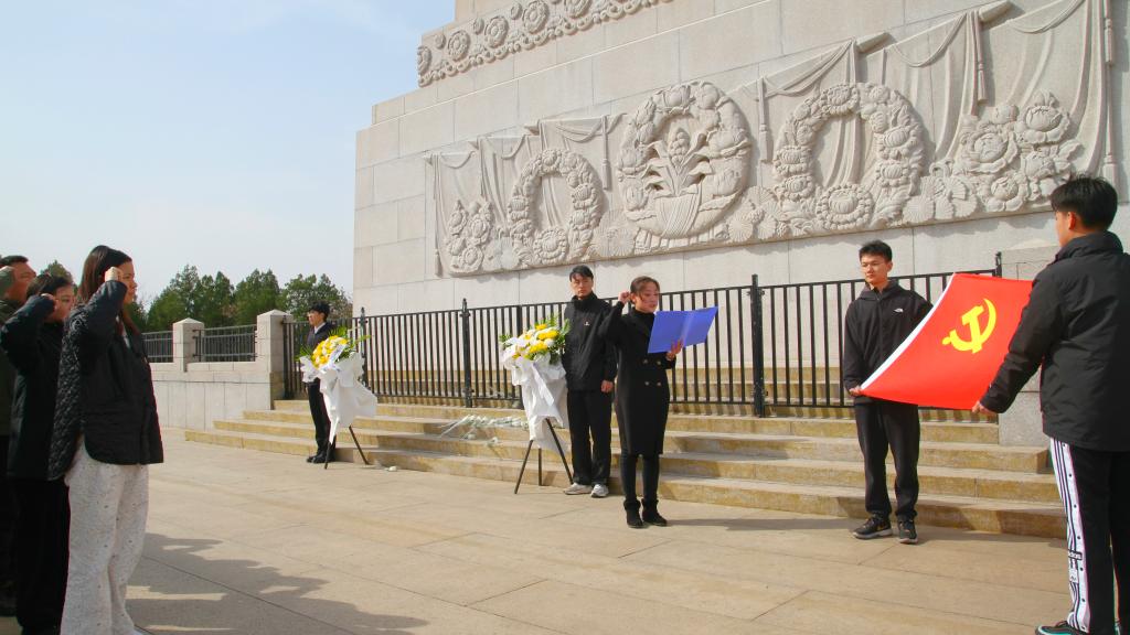 “我志愿加入中国共产党,拥护党的纲领……”在辅导员杨雅琳的领誓下,全体党员面向党旗,高举右拳庄严宣誓。铿锵誓言回荡在陵园上空,彰显了师生党员对党的忠诚信仰与赓续奋斗的决心。