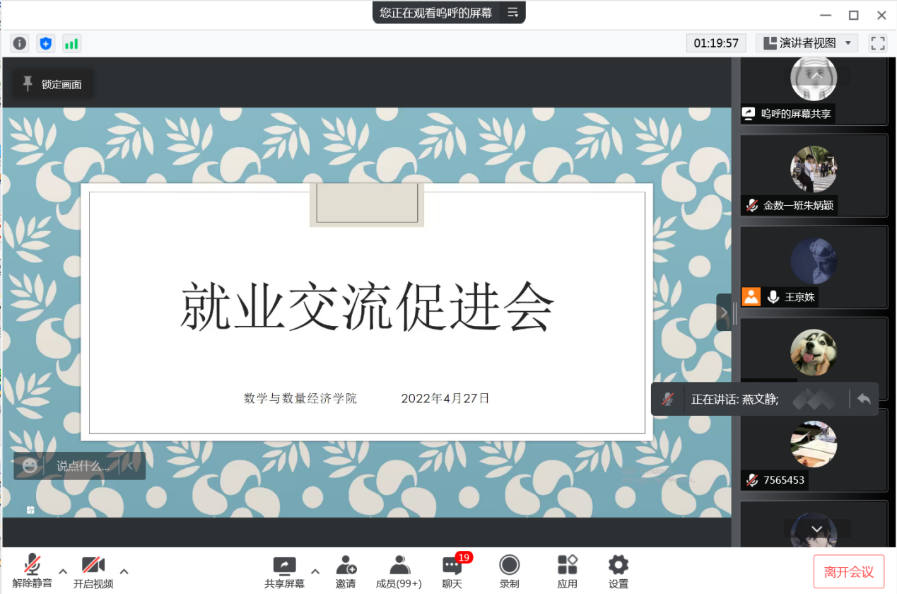4月27日下午,2018级毕业生就业交流促进会在线上召开。我院毕业班辅导员王京姝、就业办主任燕文静及2018级金融数学、数学与应用数学专业全体同学参加会议。会议开始前,学院通过多种方式,对毕业生目前面临的主要问题和思想动态做了调研,力图通过本次会议有针对性地解决就业实际问题,推动高质量就业。