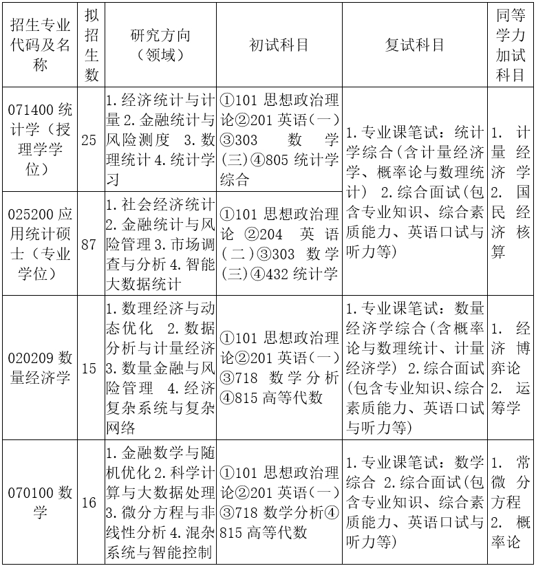 学院现设有五个硕士学位授权点:1996年获批统计学硕士学位授予权,是山东省高校中第一个统计学硕士点,2010年调整为一级学科硕士学位授予权;2002年获批数量经济学硕士学位授予权;2010年全国首批获得应用统计专业硕士(MAS)学位授予权;2012年增设金融统计学硕士学位授予权;2022年获批数学硕士学位授予权。现设有统计学一级学科博士学位授予权,2013年于应用经济学一级学科下设经济统计理论与方法二级学科博士学位建设点,2018年获批统计学一级学科博士学位授予权,2024年获批统计学中外双导师联合培养博士研究生专项计划。2023年获批统计学博士后科研流动站。