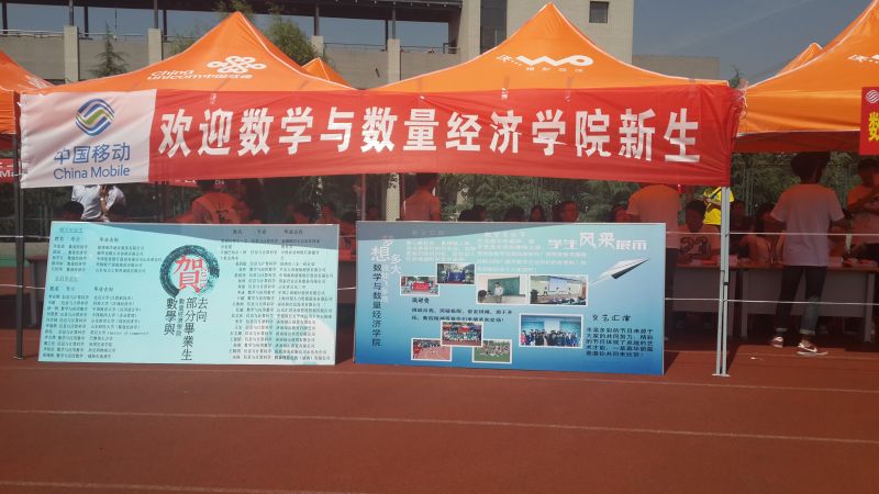2015年9月7日,新学期开始,数学与数量经济学院又迎来了一批青春激昂的莘莘学子,他们带着对大学生活的憧憬,加入了我院这个大家庭。为做好迎新工作,我院大二的同学们组成了一支满怀热情的志愿者团队,在圣井校区操场圆满完成了为期两天的2015级新生迎接工作。