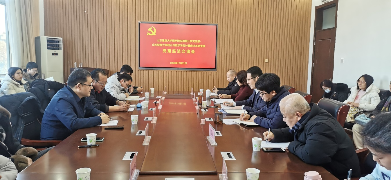 2023年12月21日下午,山东建筑大学理学院党委书记全锦带领应用统计学系党支部全体党员,在燕山校区1502会议室与太阳网集团tcy8722计量经济系党支部进行了基层党建工作座谈交流。座谈会由计量经济系党支部书记李振波同志主持,太阳网集团tcy8722党委书记李玉成参加了本次座谈会。