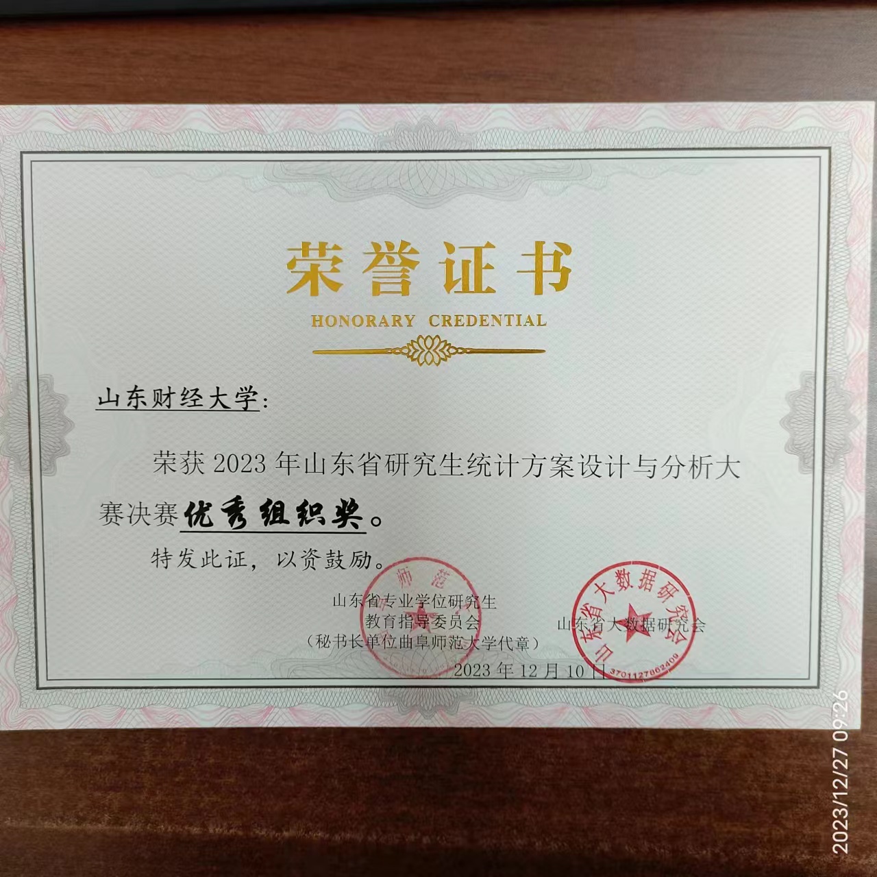近日,2023年山东省研究生统计方案设计与分析大赛决赛在曲阜师范大学落下帷幕,我院参赛研究生团队获得一等奖3项、二等奖2项、三等奖7项,杨冬梅、刘爱芹、孔凡超、万道侠四位老师荣获优秀指导教师称号,太阳集团tcy8722获颁优秀组织单位奖。