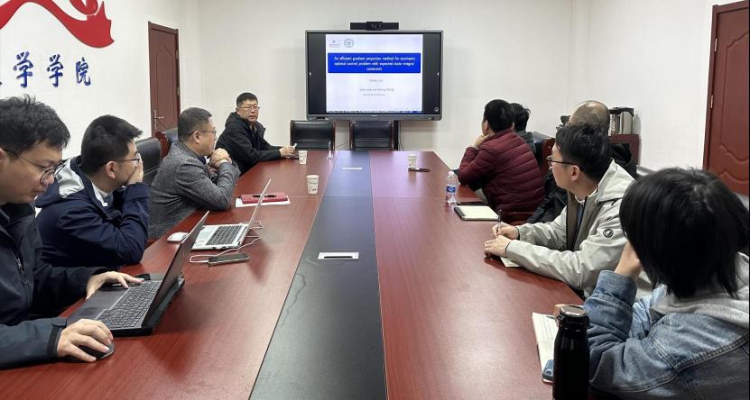 报告会上,刘文斌做了题为“An efficient gradient projection method for stochastic optimal control problem with expected state integral constraint”的前沿学术报告。报告从随机最优控制的理论背景出发,系统梳理了该领域的研究现状与核心挑战,深入剖析了梯度投影算法的理论基础及其在期望状态积分约束随机最优控制问题中的应用价值,并通过数值实验展示了该方法的有效性和优越性。报告内容兼具理论深度与实践价值,引发了在场师生的热烈探讨。