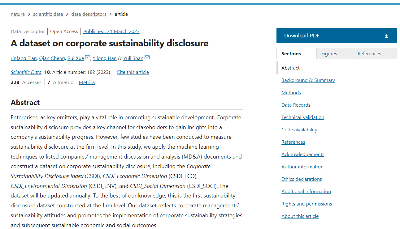 近日,太阳网集团tcy8722(统计交叉太阳集团中心)田金方教授合作团队构建的企业可持续性信息披露指数以期刊论文“A dataset on corporate sustainability disclosure”的形式发表于Nature子刊《Scientific Data》(https://doi.org/10.1038/s41597-023-02093-3)。该期刊实时影响因子12.5,JCR分区Q1,系我校A1类期刊。