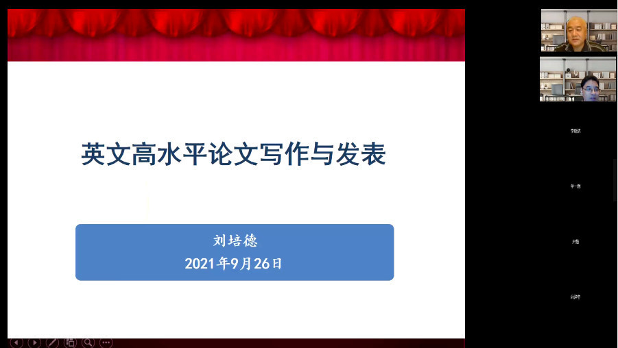 9月26日晚上,统计学院“百脉大讲坛”第94讲通过腾讯会议线上平台顺利举行。国家万人计划领军人才、山东省泰山学者、管理科学与工程学院院长刘培德教授应邀做客本次讲坛,做了题为“英文高水平论文的写作与投稿经验”的学术报告。统计学院部分教师、博士与硕士研究生,通过会议客户端参与了本次学术活动。报告会由院长李国锋教授主持。