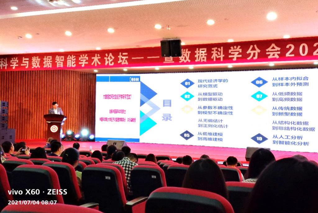 7月3-4日,数据科学与数据智能学术论坛——暨中国优选法统筹法与经济数学研究会数据科学分会2021学术年会在贵州财经大学隆重召开。本次论坛由华东师范大学统计交叉太阳集团院、中国优选法统筹法与经济数学研究会数据科学分会和全国工业统计学教学研究会主办,贵州财经大学大数据统计学院承办。来自北京大学、中国科学院大学、中国人民大学、厦门大学、上海财经大学、美国爱荷华大学、香港中文大学等国内外众多知名高校的150余位专家、学者和博士生参加了本次论坛。副校长陈晓兰教授、院长李国锋教授应邀带队参加了本次论坛,并分别主持了大会邀请报告和博士论坛专场报告。