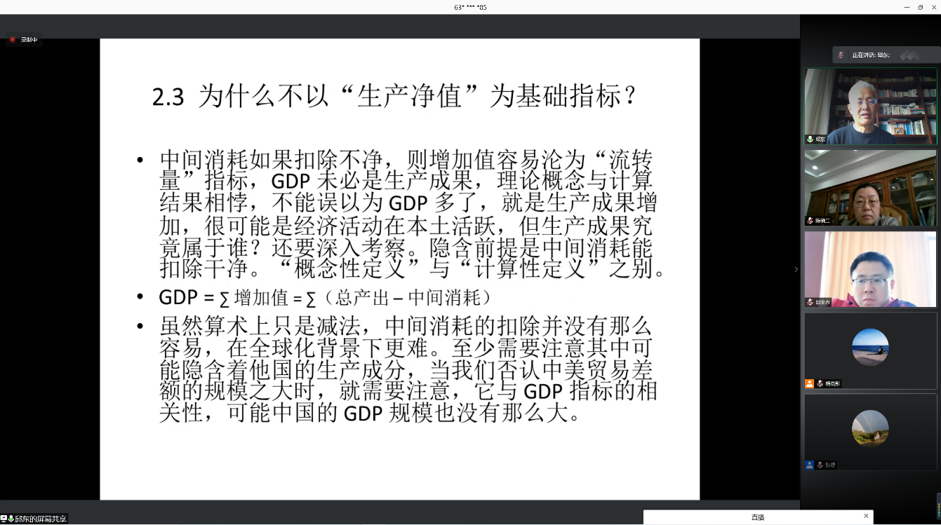 报告伊始,陈晓兰教授对邱东教授做客报告会表示了热烈欢迎和衷心感谢。随后,邱东教授围绕GDP的十大疑题及其隐含的经济统计学启示等内容进行了详尽的概述和讨论。从GDP研究的意义入手,邱东教授指出:GDP是经济指标中最具张力的,生命力极强,纵观其发展过程表明,它不仅仅是个经济指标,也代表了某种政治主张。随后,他提出了有关GDP的十大疑题,包括美国压根不是自由市场经济、“无酬家务劳动”是否应该计入GDP、为什么不以“生产净值”为基础指标、绿色GDP与常规GDP等,并以独特视角深层次地剖析了这些疑题。最后,邱东教授从经济统计学角度给出启示,指出了当下需要深入思考的国势问题以及打好学科基础的重要性等。