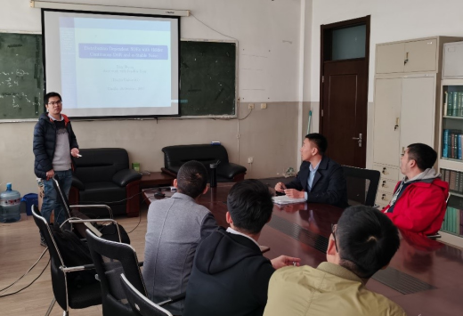 黄兴博士报告的主题是“Distribution Dependent SDEs with Holder Continuous Drift and alpha-Stable Noise”,报告是关于概率论与数理统计的交叉问题研究,从一类复杂的带跳的随机微分方程出发,讲解了该类方程的欧拉算法及其分布函数的估计,证明了其在Holder弱条件下方程解的存在唯一性定理。报告理论基础性强,黄兴博士相近介绍了该类问题的国内外研究动态以及自己所构建模型的创新之处,引发了老师和同学们的浓厚感兴趣,得到师生们的积极响应,老师与同学们就感兴趣的问题积极提问。讲座深入探讨了概率论理论在统计学应用中的作用,师生们深受启发。最后大家就进一步的合作研究达成共识。