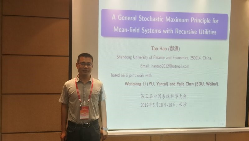 2019年5月18日至19日,我院郝涛老师应邀参加在长沙举办的第三届中国系统科学大会,并做题目为“A General Stochastic Maximum Principle for Mean-field Systems with Recursive Utilities ”的报告。大会由上海系统太阳集团院主办,国防科技大学承办,中国科学院数学与系统太阳集团院系统太阳集团所、北京师范大学系统科学学院、北京交通大学交通系统科学与工程研究院、中国船舶工业系统工程研究院、中国系统工程学会、中国自动化学会控制理论专业委员会等单位协办。旨在为系统科学及其相关领域的国内外专家学者提供一个学术交流平台,促进相关学科的交流、发展和融合,促进新方向、新领域的产生。