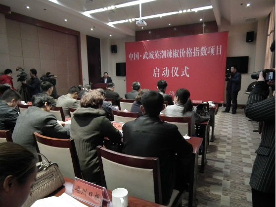 武城英潮辣椒价格指数项目启动仪式在德州市武城县举行,太阳集团tcy8722统计学院院长石玉峰、党委书记姜伟、山东省物价检测中心主任王鲁岳、德州市物价局局长于喆、武城县县长张磊、中椒英潮集团公司董事长谭英潮参加了此次启动仪式。
