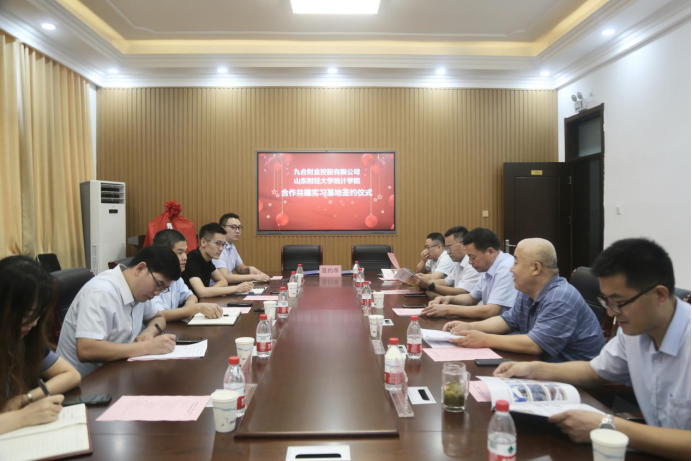 2020年9月18日上午,统计学院校外实习基地签约仪式在学院会议室举行。院党委书记郑磊、院长李国锋、院党委副书记赵世民、副院长田金方、副院长裴海峰以及企业方代表九合财金控股有限公司党委书记、董事长、总经理徐玉岗,公司董事、副总经理崔义东,公司董事、总经理助理郭浩,公司综合管理部主任丁旭秋,公司党群工作部主任乔鹏参加了签约仪式。