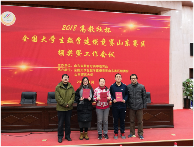 2019年1月5日,2018年全国大学生数学建模竞赛山东赛区颁奖会议在山东师范大学展开,我院刘太琳、王继强两位老师及获得全国一等奖的学生代表刘佳、郑丹丹、范家齐同学参加了会议。
